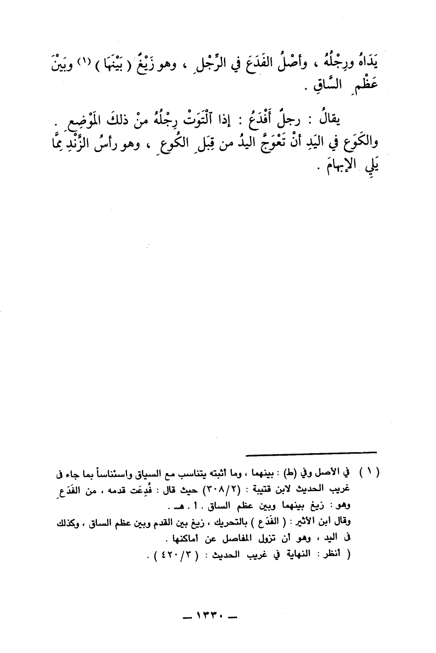 يقال: رجل أفدع: إذا التوت رجله من ذلك الموضع. والكوع في اليد أن تعوج اليد من قبل الكوع، وهو رأس الزند مما يلي الإبهام.