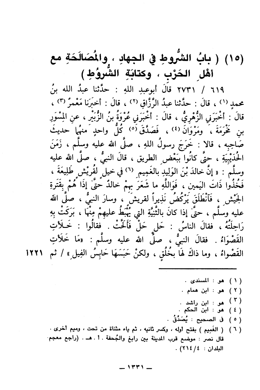619/ 2731 - قال أبو عبد الله: حدثنا عبد اله بن محمد، قال: حدثنا عبد الرزاق، قال: أخبرنا معمر، قال: أخبرني الزهري، قال: أخبرني عروة بن الزبير، عن المسور بن مخرمة، ومروان، فصدق كل واحد منهما حديث صاحبه، قالا: خرج رسول الله، صلى الله عليه وسلم، زمن الحديبية، حتى كانوا ببعض الطريق، قال النبي، صلى الله عليه وسلم: (إن خالد بن الوليد بالغميم في خيل لقريش طليعة، فخذوا ذات اليمين، فوالله ما شعر بهم خالد حتى إذا هم بقترة الجيش، فانطلق يركض نذيرا لقريش، وسار النبي، صلى الله عليه وسلم، حتى إذا كان بالثنية التي يهبط عليهم منها، بركت به راحلته، فقال الناس: حل حل فألحت. فقالوا: خلأت القصواء. فقال النبي، صلى الله عليه وسلم: (ما خلأت القصواء، وما ذاك لها بخلق، ولكن حبسها حابس الفيل) / ثم