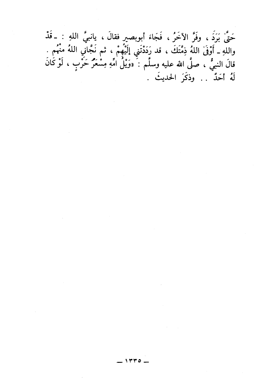 حتى برد، وفر الآخر، فجاء أبو بصير فقال، يا نبي الله: _قد والله- أوفى الله ذمتك، قد رددتني إليهم، ثم نجاني الله منهمز قال النبي، صلى الله عليه وسلم: (ويل أمه مسعر حرب، لو كان له أحد .. وذكر الحديث.