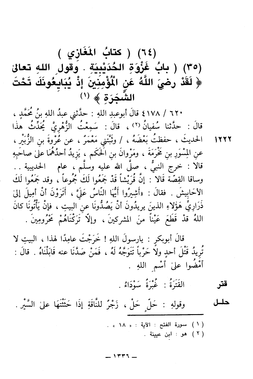 (35) باب غزوة الحديبية. وقول الله تعالى {لقد رضي الله عن المؤمنين إذ يبايعونك تحت الشجرة}
