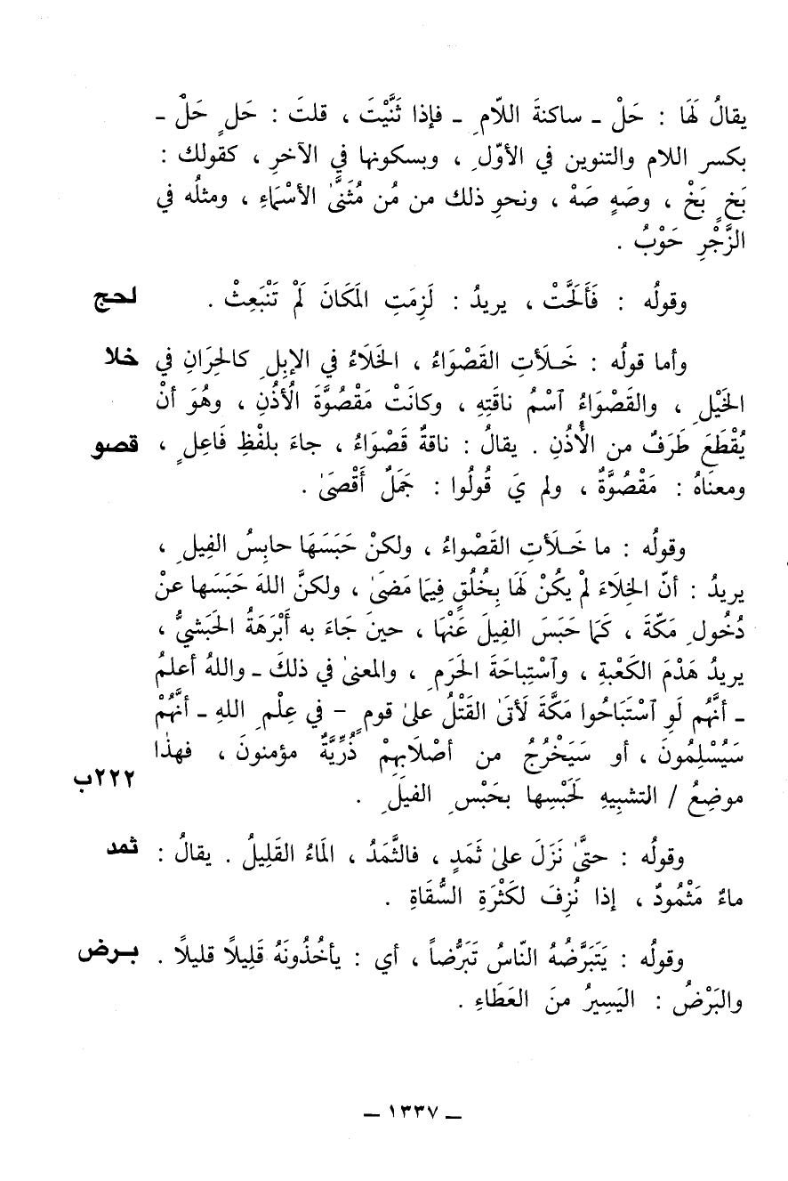 وقوله: ما خلأت القصواء، ولكن حبسها حابس الفيل، يريد: أن الخلاء لم يكن لها بخلق فيما مضى، ولكن الله حبسها عن دخول مكة، كما حبس الفيل عنها، حين جاء به أبرهة الحبشي، يريد هدم الكعبة، واستباحة الحرم، والمعنى في ذلك- والله أعلم- أنهم لو استباحوا مكة لأتى القتل على قوم- في علم الله- أنهم سيسلمون، أو سيخرج من أصلابهم ذرية مؤمنون، فهذا موضع/ التشبيه لحبسها بحبس الفيل.