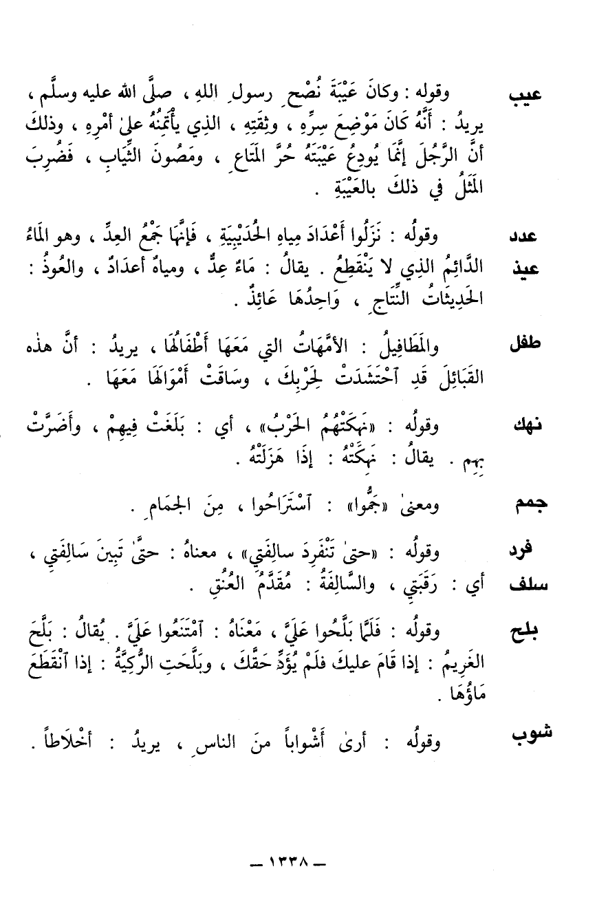 وقوله: نزلوا أعداد مياه الحديبية، فإنها جمع العد، وهو الماء الدائم الذي لا ينقطع. يقال: ماء عد، ومياه أعداد، والعوذ: الحديثات النتاج، واحدها عائذ.