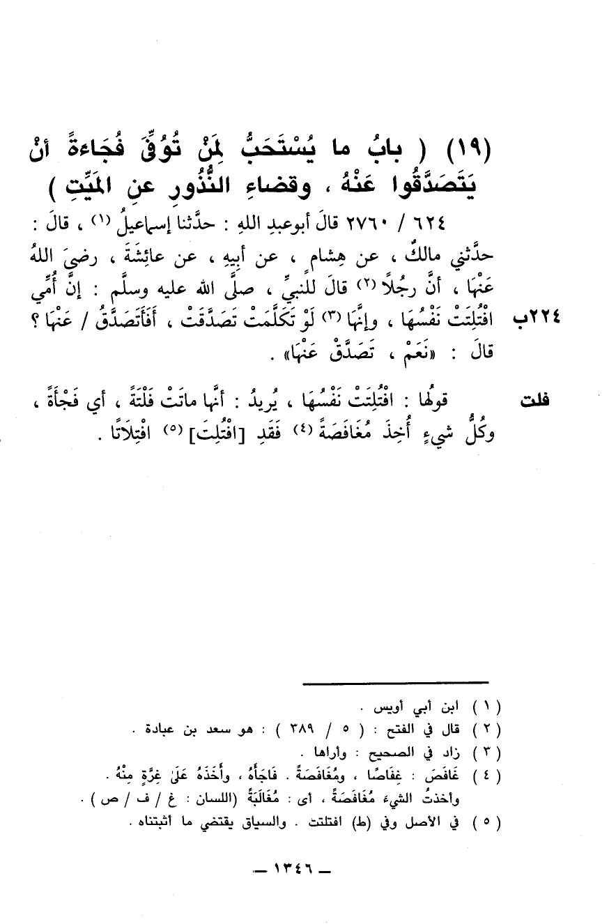 624/ 2760 - قال أبو عبد الله: حدثنا إسماعيل، قال: حدثني مالك، عن هشام، عن أبيه، عن عائشة، رضي الله عنها، أن رجلا قال للنبي، صلى الله عليه وسلم: إن أمي افتلتت نفسها، وإنها لو تكلمت تصدقت، أفأتصدق/ عنها؟ قال: (نعم، تصدق عنها).