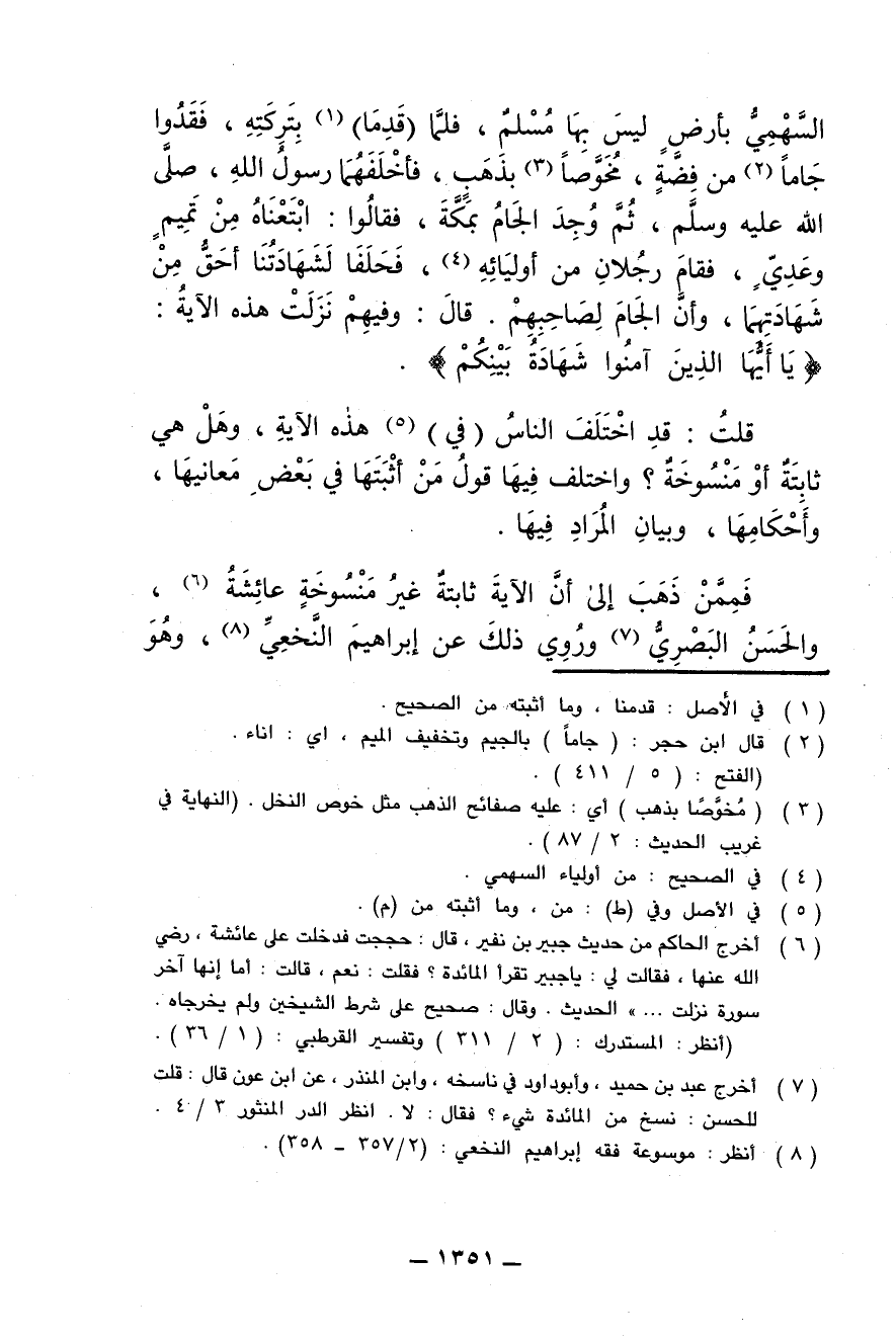 السهمي بأرض ليس بها مسلم، فلما (قدما) بتركته، فقدوا جاما من فضة، مخوصا بذهب، فأخلفهما رسول الله، صلى الله عليه وسلم، ثم وجد الجام بمكة، فقالوا: ابتعناه من تميم وعدي، فقام رجلان من أوليائه، فحلفا لشهادتنا أحق من شهادتهما، وأن الجام لصاحبهم. قال: وفيهم نزلت هذه الآية: {يا أيها الذين آمنوا شهادة بينكم}.