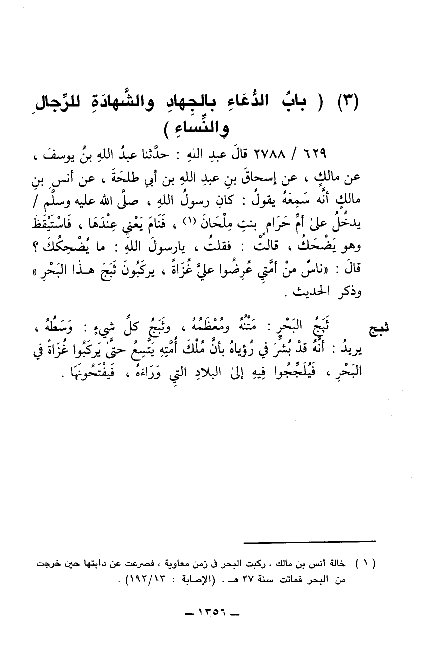 629/ 2788 - قال عبد الله: حدثنا عبد الله بن يوسف، عن مالك، عن اسحاق بن عبد الله بن أبي طلحة، عن أنس بن مالك أنه سمعه يقول: كان رسول الله، صلى الله عليه وسلم/ يدخل على أم حرام بنت ملحان، فنام يعني عندها، فاستيقظ وهو يضحك، قالت: فقلت، يا رسول الله: ما يضحكك؟ قال: (ناس من أمتي عرضوا علي غزاة، يركبون ثبج هذا البحر) وذكر الحديث.