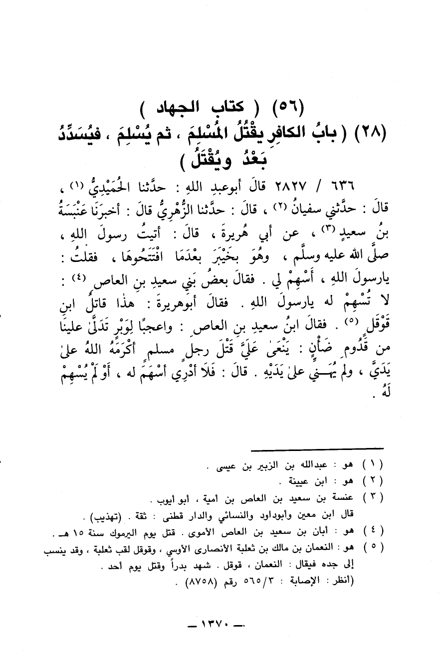636/ 2827 - قال أبو عبد الله: حدثنا الحميدي، قال: حدثني سفيان، قال: حدثنا الزهري قال: أخبرنا عنبسة بن سعيد، عن أبي هريرة، قال: أتيت رسول الله، صلى الله عليه وسلم، وهو بخيبر بعدما افتتحوها، فقلت: يارسول الله، أسهم ليه. فقال بعض بني سعيد بن العاص: لا تسهم له يا رسول الله. فقال أبو هريرة: هذا قاتل ابن قوقل. فقال ابن سعيد بن العاص: واعجبا لوبر تدلى علينا من قدوم ضأن: ينعى علي قتل رجل مسلم أكرمه الله على يدي، ولم يهني على يديه. فقال: فلا أدري أسهم له، أو لم يسهم له.