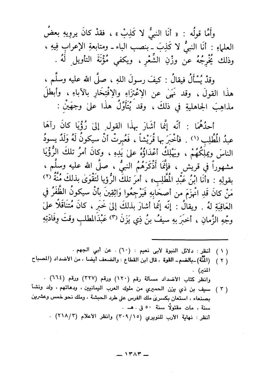 أحدهما: أنه إنما أشار بهذا القول إلى رؤيا كان رآها عبد المطلب. فأخبر بها قريشا، فعبرت أن سيكون له ولد يسود الناس ويملكهم، ويهلك أعداؤه على يده، وكان أمر تلك الرؤيا مشهورا في قريش، فغنما أذكرهم النبي، صلى الله عليه وسلم، بقوله: (أنا ابن عبد المطلب)، أمر تلك الرؤيا لتقى بذلك منة من كان قد انهزم من أصحابه فيرجعوا واثقين بأن سيكون الظفر في العاقبة له. ويقال: إنه إنما أشار بذلك إلى خبر، كان متناقلا على وجه الزمان، أخبر به سيف بن ذي يزن عبد المطلب وقت وفادته