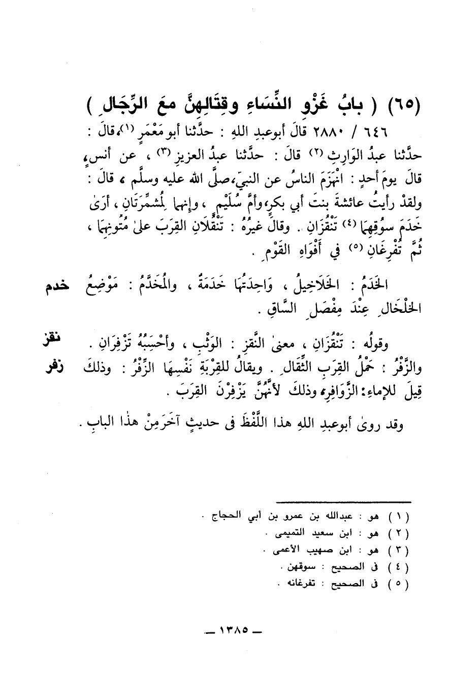 646/ 2880 - قال أبو عبد الله: حدثنا أبو معمر، قال: حدثنا عبد الوارث قال: حدثنا عبد العزيز، عن أنس، قال يوم أحد: انهزم الناس عن النبي، صلى الله عليه وسلمن قال: ولقد رأيت عائشة بنت أبي بكر، وأم سليم، وإنهما لمشمرتان، أرى خدم سوقهما تنقزان. وقال غيره: تنقلان القرب على متونهما، ثم تفرغان في أفواه القوم.