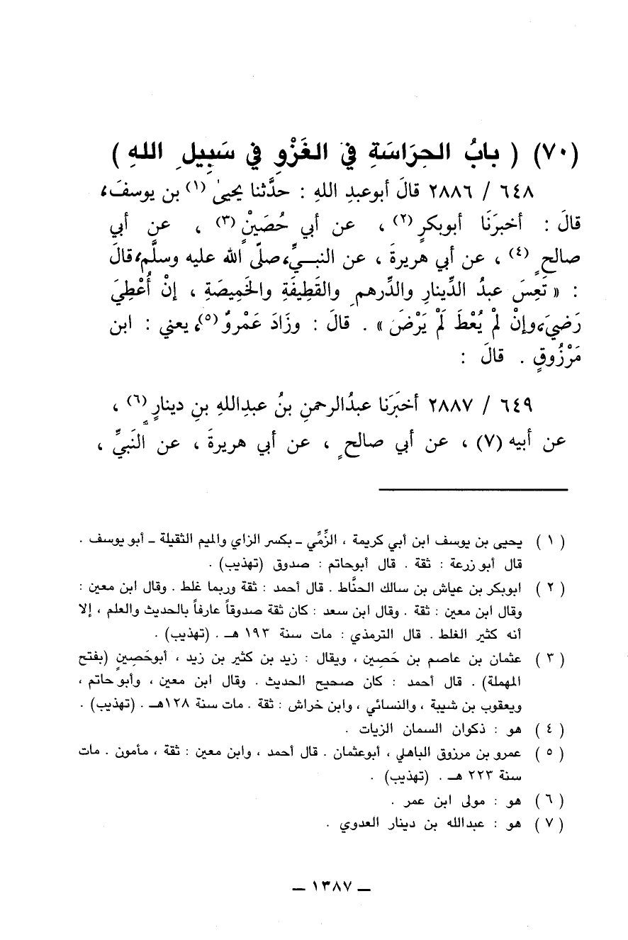 648/ 2886 - قال أبو عبد الله: حدثنا يحيى بن يوسف، قال: أخبرنا أبو بكر، عن أبي حصين، عن أبي صالح، عن أبي هريرة، عن النبي، صلى الله عليه وسلم، قال: (تعس عبد الدينار والدرهم والقطيفة والخميصة، إن أعطي رضي، وإن لم يعط لم يرض). قال: وزاد عمرو، يعني: ابن مرزوق. قال: