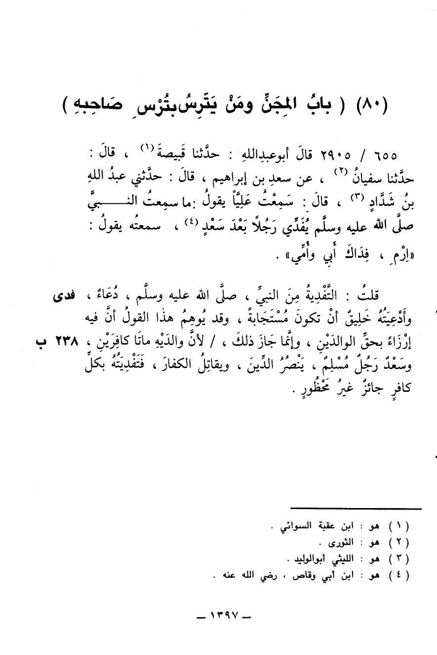 655/ 2905 - قال أبو عبد الله: حدثنا قبيصة، قال: حدثنا سفيان، عن سعد بن إبراهيم، قال: حدثني عبد الله بن شداد، قال: سمعت عليا يقول: ما سمعت النبي صلى الله عليه وسلم يفدي رجلا بعد سعد، سمعته يقول: (ارم، فداك أبي وأمي).