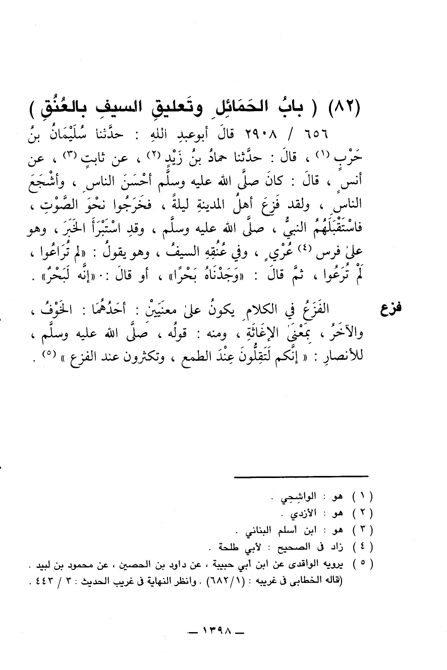656/ 2908 - قال أبو عبد الله: حدثنا سليمان بن حرب، قال: حدثنا حماد بن زيد، عن ثابت، عن أنس، قال: كان صلى الله عليه وسلم أحسن الناس، أشجع الناس، ولقد فزع أهل المدينة ليلة، فخرجوا نحو الصوت، فاستقبلهم النبي، صلى الله عليه وسلم، وقد استبرأ الخبر، وهو على فرس عري، وفي عنقه السيف، وهو يقول: (لم تراعوا، لم ترعوا، ثم قال: (وجدناه بحرا)، أو قال: (إنه لبحر).