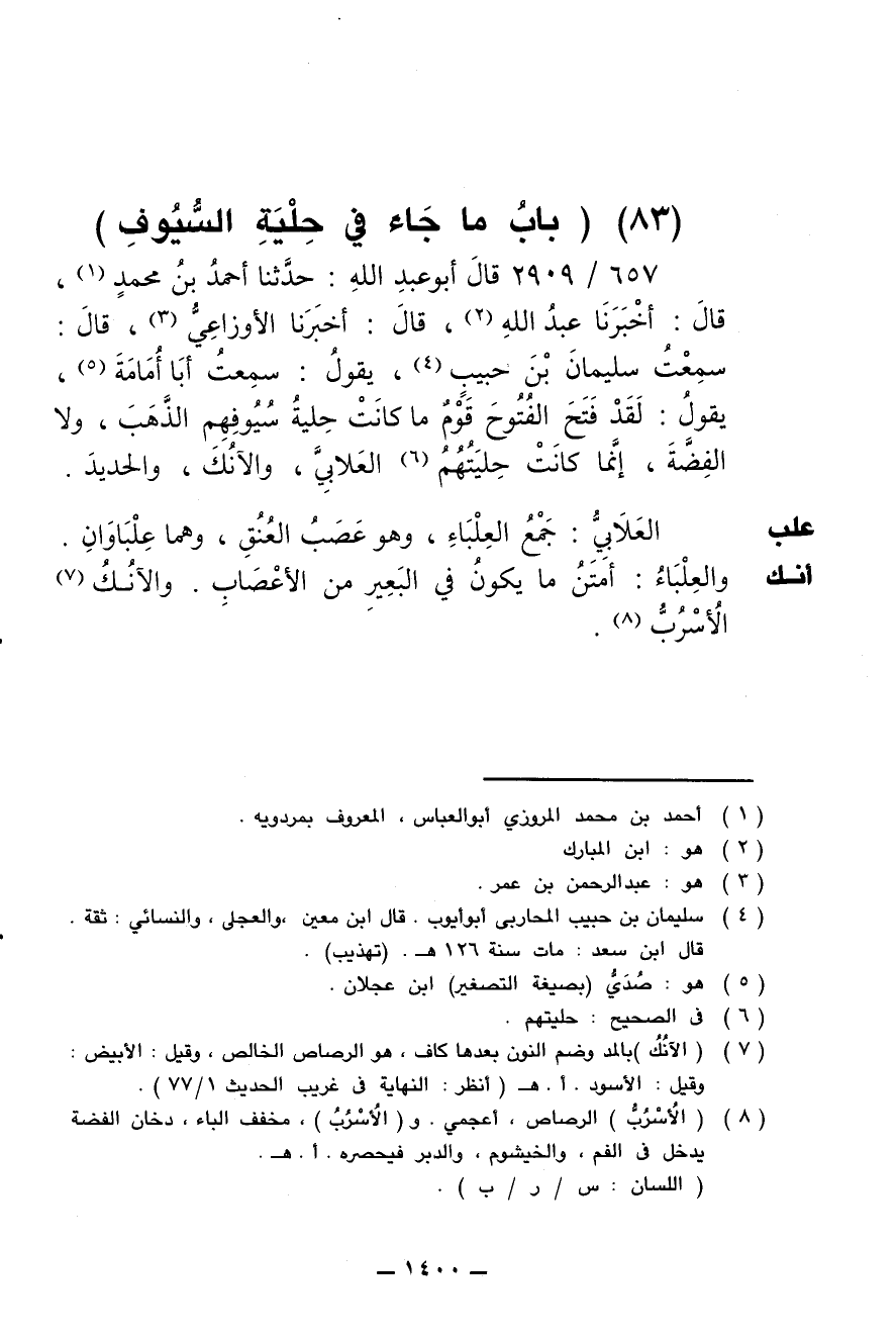 657/ 2909 - قال أبو عبد الله: حدثنا أحمد بن محمد، قال: أخبرنا عبد الله، قال: أخبرنا الأوزاعي، قال: سمعت سليمان بن حبيب، يقول: سمعت أبا أمامة، يقول: لقد فتح الفتوح قوم ما كانت حلية سيوفهم الذهب، ولا الفضة، إنما كانت حليتهم العلابي، والآنك، والحديد.