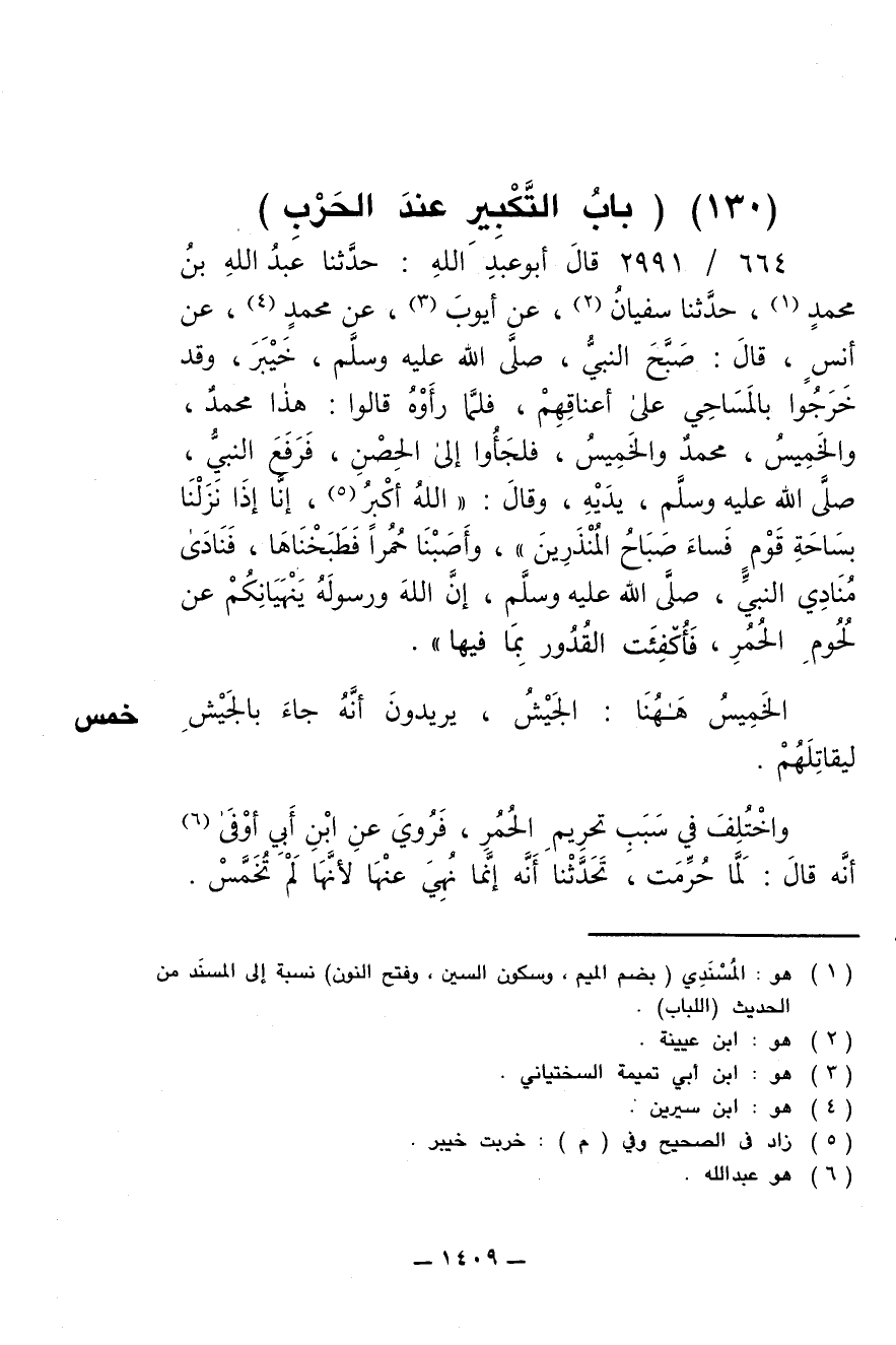 664/ 2991 - قال أبو عبد الله: حدثنا عبد اله بن محمد، حدثنا سفيان، عن أيوب، عن محمد، عن أنس، قال صبح النبي، صلى الله عليه وسلم، خيبر، وقد خرجوا بالمساحي على أعناقهم، فلما رأوه قالوا: هذا محمد والخميس، محمد والخميس، فلجأوا إلى الحصن، فرفع النبي، صلى الله عليه وسلم، يديه، وقال: (الله أكبر، إنا إذا نزلنا بساحة قوم فساء صباح المنذرين)، وأصبنا حمرا فطبخناها، فنادى منادي النبي، صلى الله عليه وسلم، إن الله ورسوله ينهيانكم عن لحوم الحمر، فأكفئت القدور بما فيها).