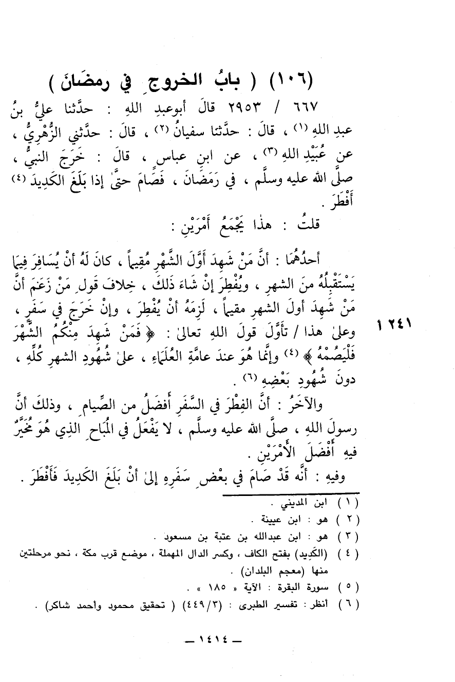 667/ 2953 - قال أبو عبد الله: حدثنا على بن عبد الله، قال حدثنا سفيان، قال: حدثني الزهري، عن عبيدا لله، عن ابن عباس، قال: خرج النبي، صلى الله عليه وسلم، في رمضان، فصام حتى إذا بلغ الكديد أفطر