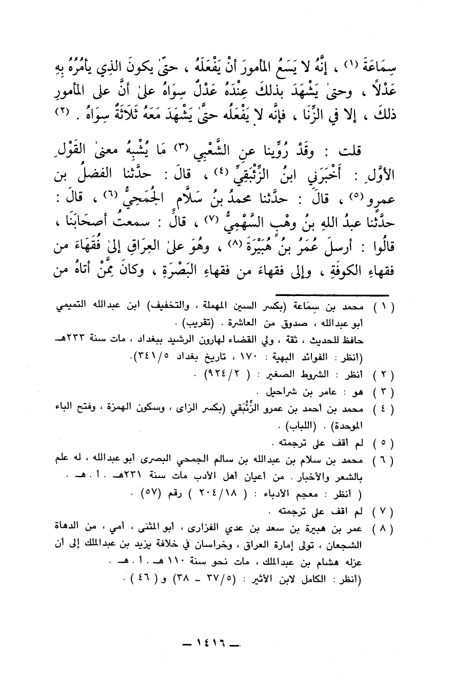 قلت: وقد روينا عن الشعبي ما يشبه معنى القول الأول: أخبرني ابن الزئبقي، قال: حدثنا الفضل بن عمرو، قال: حدثنا محمد بن سلام الجمحي، قال: حدثنا عبد الله بن وهب السهمي، قال: سمعت أصحابنا، قالوا: أرسل عمر بن هبيرة، وهو على العراق إلى الفقهاء من فقهاء الكوفة، وإلى فقهاء البصرة، وكان ممن أتاه من