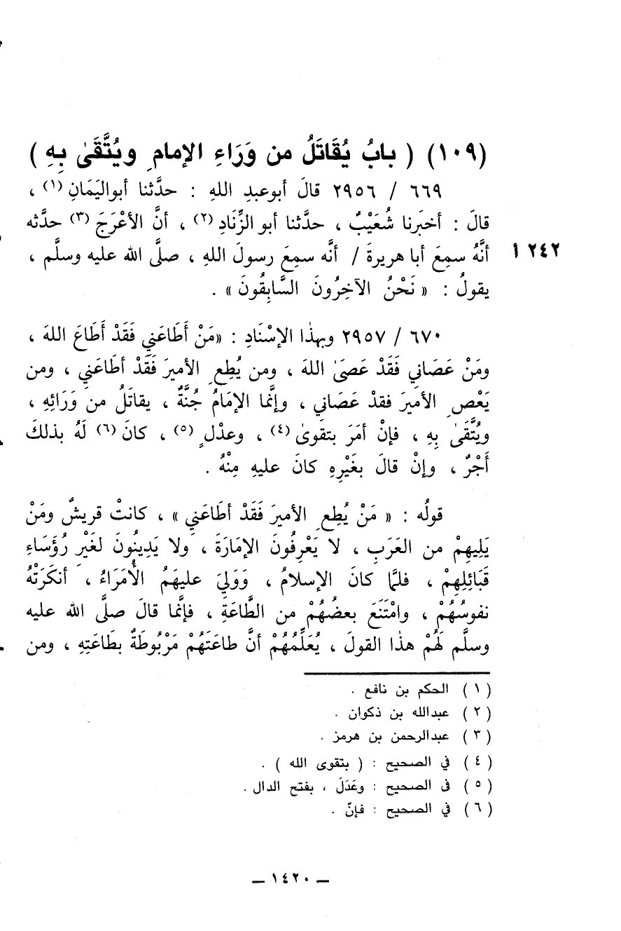 670/ 2957 - وبهذا الإسناد: (من أطاعني فقد أطاع الله، ومن عصاني فقد عصى الله، ومن يطع الأمير فقد أطاعني، ومن يعص الأمير فقد عصاني، وإنما الإمام جنة، يقاتل من ورائه، ويتقى به، فإن أمر بتقوى، وعدل، كان له بذلك أجر، وإن قال بغيره كان عليه منه.