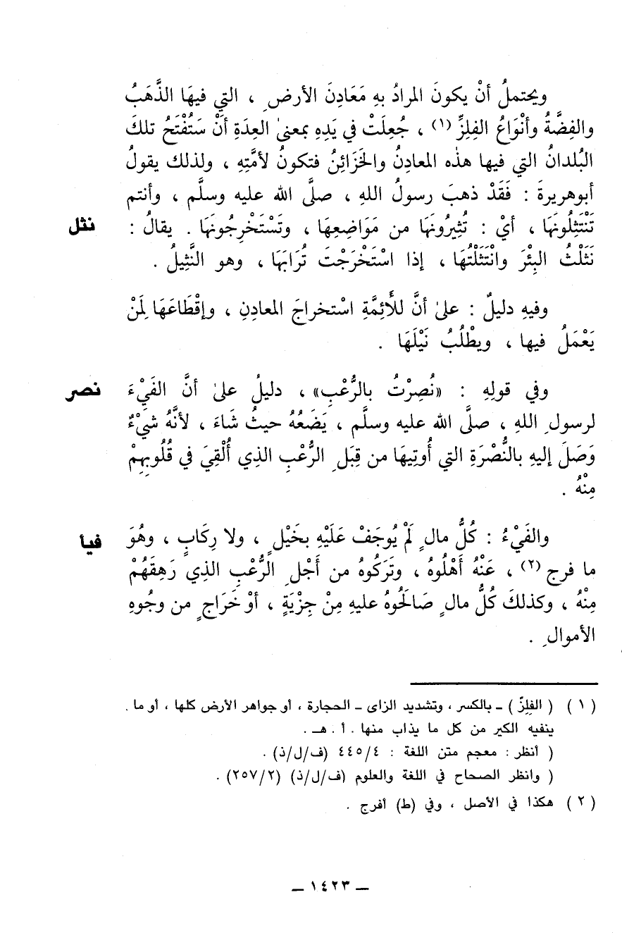 والفيء: كل مال لم يوجف عليه بخيل، ولا ركاب، وهو ما فرج، عنه أهلوه، وتركوه من اجل الرعب الذي رهقهم منه، وكذلك كل مال صالحوه عليه من جزية، أو خراج من وجوه الأموال.