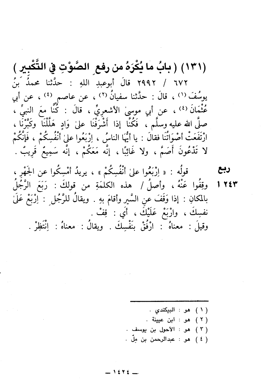 672/ 2992 - قال أبو عبد الله: حدثنا محمد بن يوسف، قال: حدثنا سفيان، عن عاصم، عن أبي عثمان، عن أبي موسى الأشعري، قال: كنا مع النبي، صلى الله عليه وسلم، فكنا إذا أشرفنا على واد هللنا وكبرنا، ارتفعت أصواتنا فقال: يا أيها الناس، اربعوا على أنفسكم، فإنكم لا تدعون أصم، ولا غائبا، إنه معكم، إنه سميع قريب.