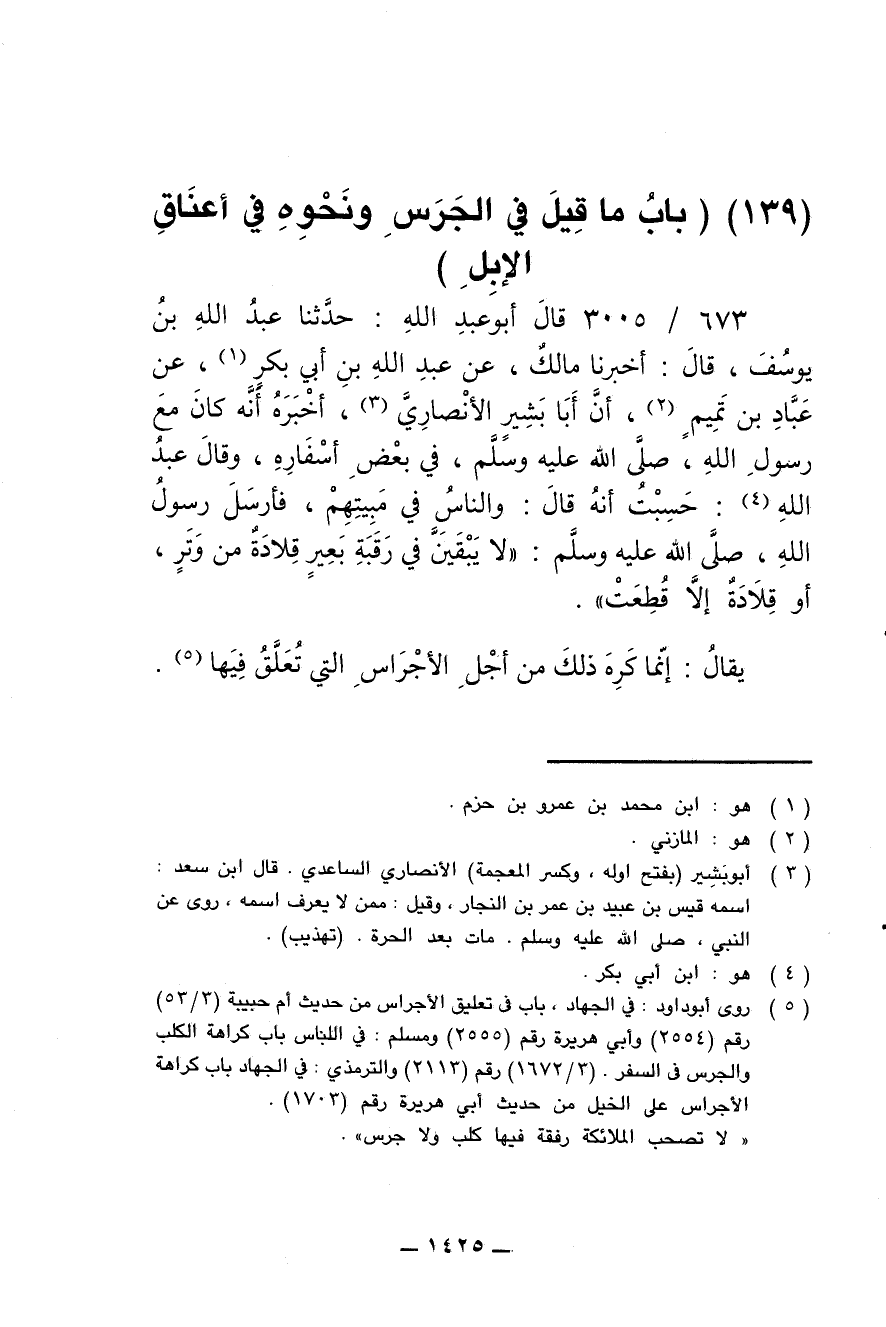 673/ 3005 - قال أبو عبد الله: حدثنا عبد الله بن يوسف، قال: أخبرنا مالك، عن عبد الله بن أبي بكر، عن عباد بن تميم، أن أبا بشير الأنصاري، أخبره أنه كان مع رسول الله، صلى الله عليه وسلم، في بعض أسفاره، وقال عبد الله: حسبت أن قال: والناس في مبيتهم، فأرسل رسول الله، صلى الله عليه وسلم: (لا يبقين في رقبة بعير قلادة من وتر، أو قلادة إلا قطعت).
