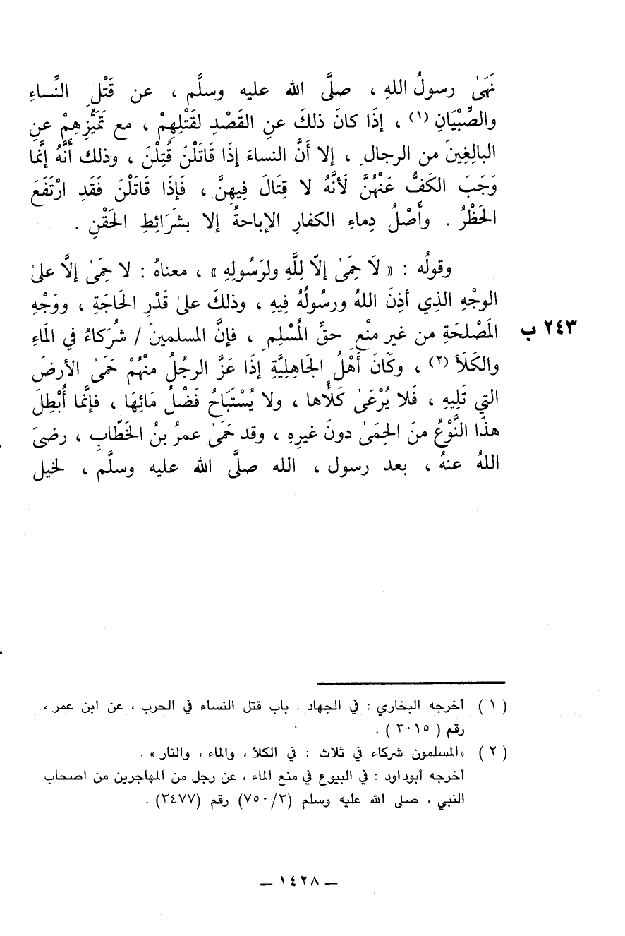 نهى رسول الله، صلى الله عليه وسلم، عن قتل النساء والصبيان، إذا كان ذلك عن القصد لقتلهم، مع تميزهم عن البالغين من الرجال، إلا أن النساء إذا قاتلن قتلن وذلك أنه إنما وجب الكف عنهن لان لا قتال فيهن، فإذا قاتلن فقد ارتفع الحظر. وأصل دماء الكفار الإباحة إلا بشرائط الحقن.