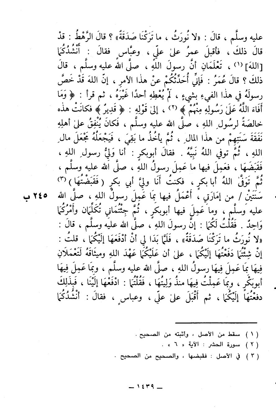 عليه وسلم، قال: (لا نورث، ما تركنا صدقة)؟ قال الرهط: قد قال ذلك، فأقبل عمر على علي، وعباس فقال: أنشدكما (الله)، تعلمان أن رسول الله، صلى الله عليه وسلم، قال ذلك؟ قال عمر: فإني أحدثكم عن هذا الأمر، إن الله قد خص رسوله في هذا الفيء بشيء، لم يعطه أحدا غيره، ثم قرأ: {وما أفاء الله على رسوله منهم}، إلى قوله: {قدير} فكانت هذه خالصة لرسول الله، صلى الله عليه وسلم، فكان ينفق على أهله نفقة سنتهم من هذا المال، ثم يأخذ ما بقي فيجعل مجعل مال الله، ثم توفي الله نبيه. فقال أبو بكر: أنا ولي رسول الله، فقبضها، فعمل فيها ما عمل رسول الله، صلى الله عليه وسلم، ثم توفى الله أبا بكر، فكنت أنا ولي أبي بكر (فقبضتها) سنتين من إمارتي، أعمل فيها بما عمل رسول الله، صلى الله عليه وسلم، وما عمل فيها أبو بكرن ثم جئتماني تكلمان وأمركما واحد. فقلت لكما: إن رسول الله، صلى الله عليه وسلم، قال: (لا نورث ما تركنا صدقة)، فلما بدا لي أن أدفعها إليكما، قلت: إن شئتما دفعتها إليكما، على أن عليكما عهد الله وميثاق لتعملان فيها بما عمل فيها رسول الله، صلى الله عليه وسلم، وبما عمل فيها أبو بكر، وبما عملت فيها منذ وليتها، فقلتما: ادفعها إلينا، فبذل دفعتها إليكما، ثم أقبل على علي، وعباس، فقال: أنشدكما