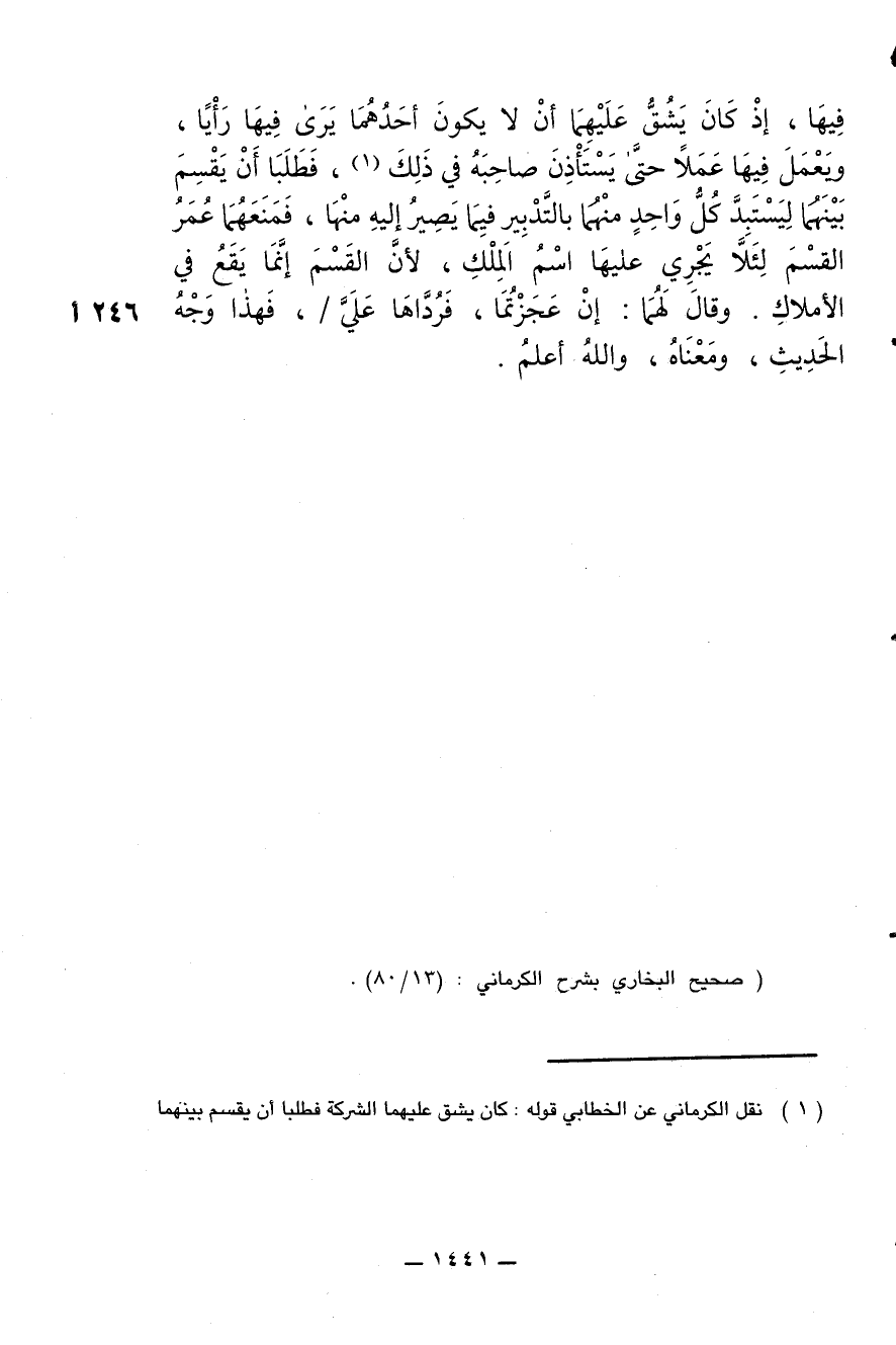 فيها، إذ كان يشق عليهما أن لا يكون احدهما يرى فيها رأيا، ويعمل فيها عملا حتى يستأذن صاحبة في ذلك، فطلبا أن يقسم بينهما ليستبد كل واحد منهما بالتدبير فيما يصير إليه منها، فمنعهما عمر القسم لئلا يجري عليها اسم الملك، لأن القسم إنما يقع في الأملاك. وقال لهما: إن عجزتما، فرداها علي، فهذا وجه الحديث، ومعناه، والله أعلم.