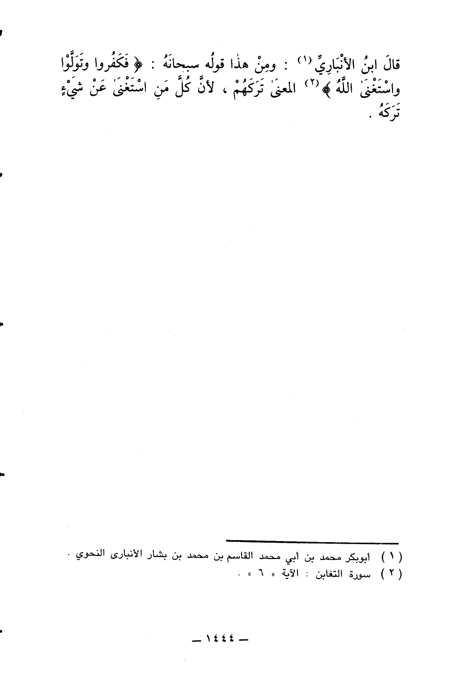 قال ابن الأنباري: ومن هذا قوله سبحانه: {فكروا وتولوا واستغنى الله} المعنى تركهم، لأن كل من استغنى عن شيء تركه.