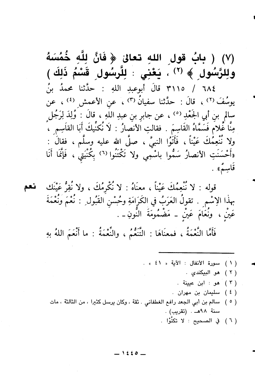 684/ 3115 - قال أبو عبد الله: حدثنا محمد بن يوسف، قال: حدثنا سفيان، عن الأعمش، عن سالم بن أبي الجعد، عن جابر بن عبد الله، قال: ولد لراجل منا غلام فسماه القاسم. فقالت الأنصار: لا نكنيك أبا القاسم، ولا ننعمك عينا، فأتوا النبي، صلى الله عليه وسلم، فقال: (أحسنت الأنصار سموا باسمي ولا تكتنوا بكنيتي، فإنما أنا قاسم).