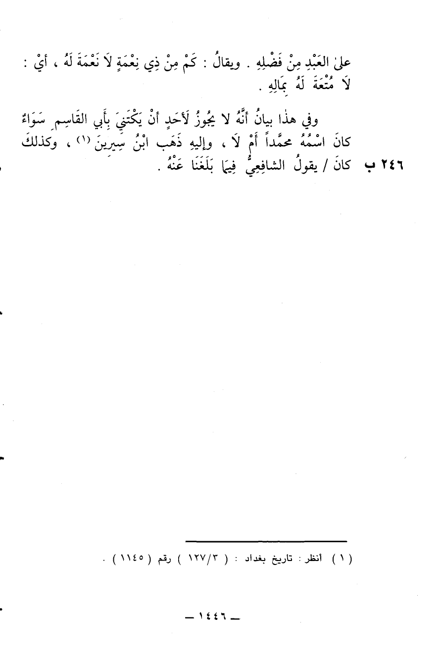 وفي هذا البيان أنه لا يجوز لأحد أن يكتني بأبي القاسم سواء كان اسمه محمدا أم لا، وإليه ذهب ابن سيرين، وكذلك كان/ يقول الشافعي فيما بلغنا عنه.
