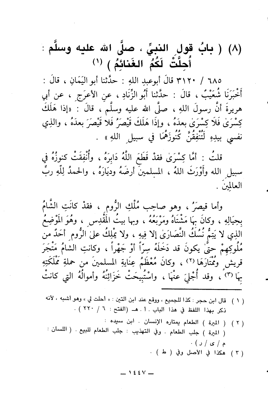685/ 3120 - قال أبو عبد الله: حدثنا أبو اليمان، قال: أخبرنا شعيب، قال: حدثنا أبو الزناد، عن الأعرج، عن أبي هريرة أن رسول الله، صلى الله عليه وسلم، قال: (إذا هلك كسرى فلا كسرى بعده، وإذا هلك قيصر فلا قيصر بعدهن والذي نفي بيده لتنفقن كنوزهما في سبيل الله).