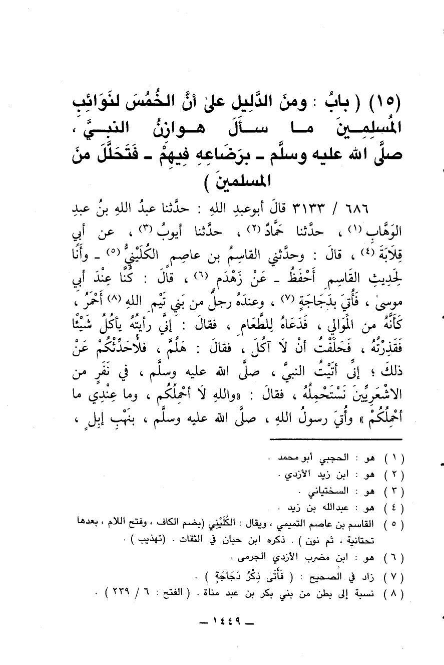 686/ 3133 - قال أبو عبد الله: حدثنا عبد الله بن عبد الوهاب، حدثنا حماد، حدثنا أيوب، عن أبي قلابة، قال: وحدثني القاسم بن عاصم الكليني- وأنا لحديث القاسم أحفظ- عن زهدم، قال: كنا عند أبي موسى، فأتى بدجاجة، وعنده رجل من بني تيم الله احمر، كأنه من الموالين فدعاه للطعام، فقال إني رأيته يأكل شيئا فقذرته، فحلفت أن لا آكل، فقال: هلم، فلأحدثكم عن ذلك، إني أتيت النبي، صلى الله عليه وسلم، في نفر من الأشعريين نستحمله، فقال: (والله لا أحملكم، وما عندي ما أحملكم) وأتى رسول الله، صلى الله عليه وسلم، بنهب إبل،