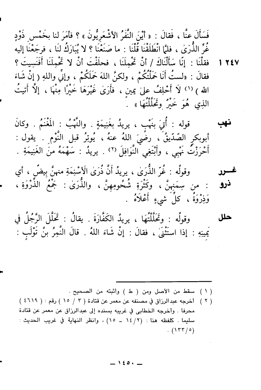 فسأل عنا، فقال: (أين النفر الأشعريون)؟ فأمر لنا بخمس ذود غُر الذري، فلما انطلقنا قلنا: ما صنعنا؟ لا يبارك لنا، فرجعنا إليه فقلنا: إنا سألناك أن تحملنا، فحلفت أن لا تحملنا أفنسيت؟ فقال: (لست أنا حملتكم، ولكن الله حملكم، وإني والله (إن شاء الله) لا أحلف على يمين، فأرى غيرها خيرا منها، إلا أتيت الذي هو خير وتحللتها).