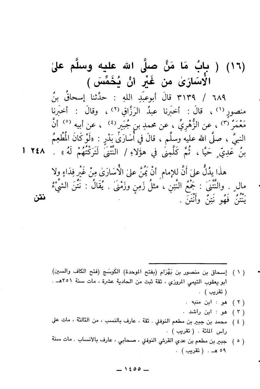 689/ 3139 - قال أبو عبد الله: حدثنا إسحاق بن منصور، قال: أخبرنا عبد الرزاق، وقال: أخبرنا معمر، عن الزهري، عن محمد بن جبير، عن أبيه أن النبي، صلى الله عليه وسلم، قال في أساري بدر: (لو كان المطعم بن عدي حيا، ثم كلمني في هؤلاء/ النتنى لتركتهم له).