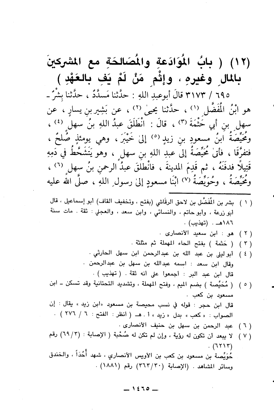 695/ 3173 - قال أبو عبد الله: حدثنا مسدد، حدثنا بشر- هو ابن المفضل، حدثنا يحيى، عن بشير بن يسار، عن سهل بن أبي حثمة، قال: انطلق عبد الله بن سهل، ومحيصة ابن مسعود بن زيد إلى خيبر، وهي يومئذ صلح، فتفرقا، فأتى محيصة إلى عبد الله بن سهل، وهو يتشحط في دمه قتيلا فدفنه، ثم قدم المدينة فانطلق عبد الرحمن بن سهل، ومحيصة، وحويصة ابنا مسعود إلى رسول الله، صلى الله عليه