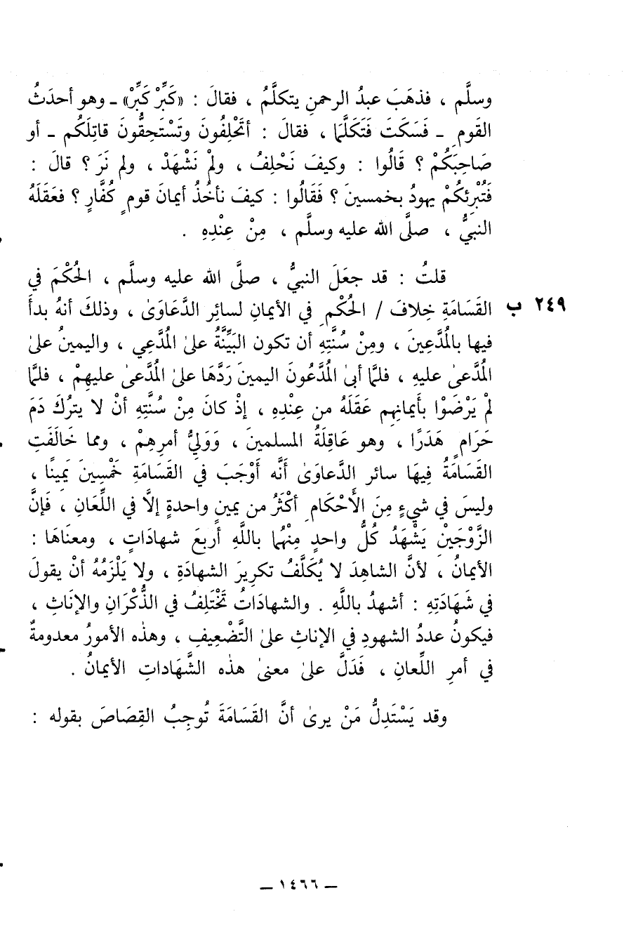 قلت: قد جعل النبي، صلى الله عليه وسلم، الحكم في القسامة خلاف/ الحكم في الأيمان لسائر الدعاوي، وذلك أنه بدأ فيها بالمدعين، ومن سنته أن تكون البينة على المدعي، واليمين على المدعي عليه، فلما أبى المدعون اليمين ردها على المدعى عليهم، فلما لم يرضوا بأيمانهم عقله من عنده، إذ كان من سنته أن لا يترك دم حرام هدرا، وهو عاقلة المسلمين، وولي أمرهم، ومما خالفت القسامة فيها سائر الدعاوي أنه اوجب في القسامة خمسين يمينا، وليس في شيء من الأحكام أكثر من يمين واحدة إلا في اللعان، فإن الزوجين يشهد كل واحد منهما بالله أربع شهادات، ومعناها: الأيمان، لأن الشاهد لا يكلف تكرير الشهادة، ولا يلزمه أن يقول في شهادته: أشهد بالله. والشهادات تختلف في الذكران والإناث، فيكون عدد الشهود في الإناث على لتضعيف، وهذه الأمور معدومة في أمر اللعان فدل على معنى هذه الشهادات الأيمان.