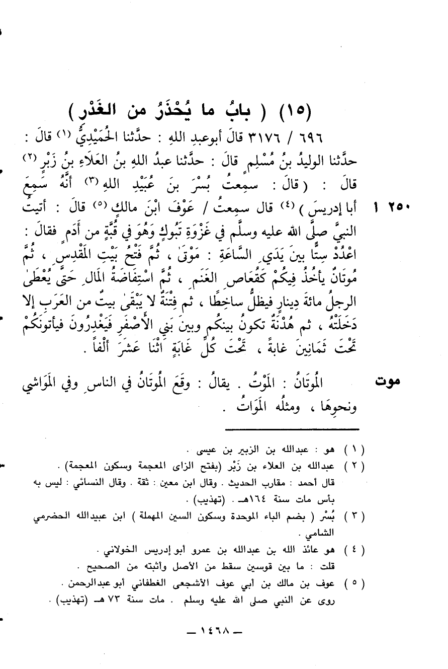 696/ 3176 - قال أبو عبد الله: حدثنا الحميدي قال: حدثنا الوليد بن مسلم قال: حدثنا عبد الله بن العلاء بن زبر قال: (قال: سمعت بسر بن عبيد الله أنه سمع أبا إدريس) قال سمعت/ عوف ابن مالك قال: أتيت النبي صلى الله عليه وسلم في غزوة تبوك وهو في قبة من أدم فقال: اعدد ستا بين يدي الساعة: موتى، ثم فتح بيت المقدس، ثم موتان يأخذ فيكم كقعاص الغنم، ثم استفاضة المال حتى يعطى الرجل مائة دينار فيظل ساخطا، ثم فتنة لا يبقى بيت من العرب إلا دخلته، ثم هدنة تكون بينكم وبين بني الأصفر فيغدرون فيأتونكم تحت ثمانين غابة، تحت كل غابة اثنا عشر ألفا.