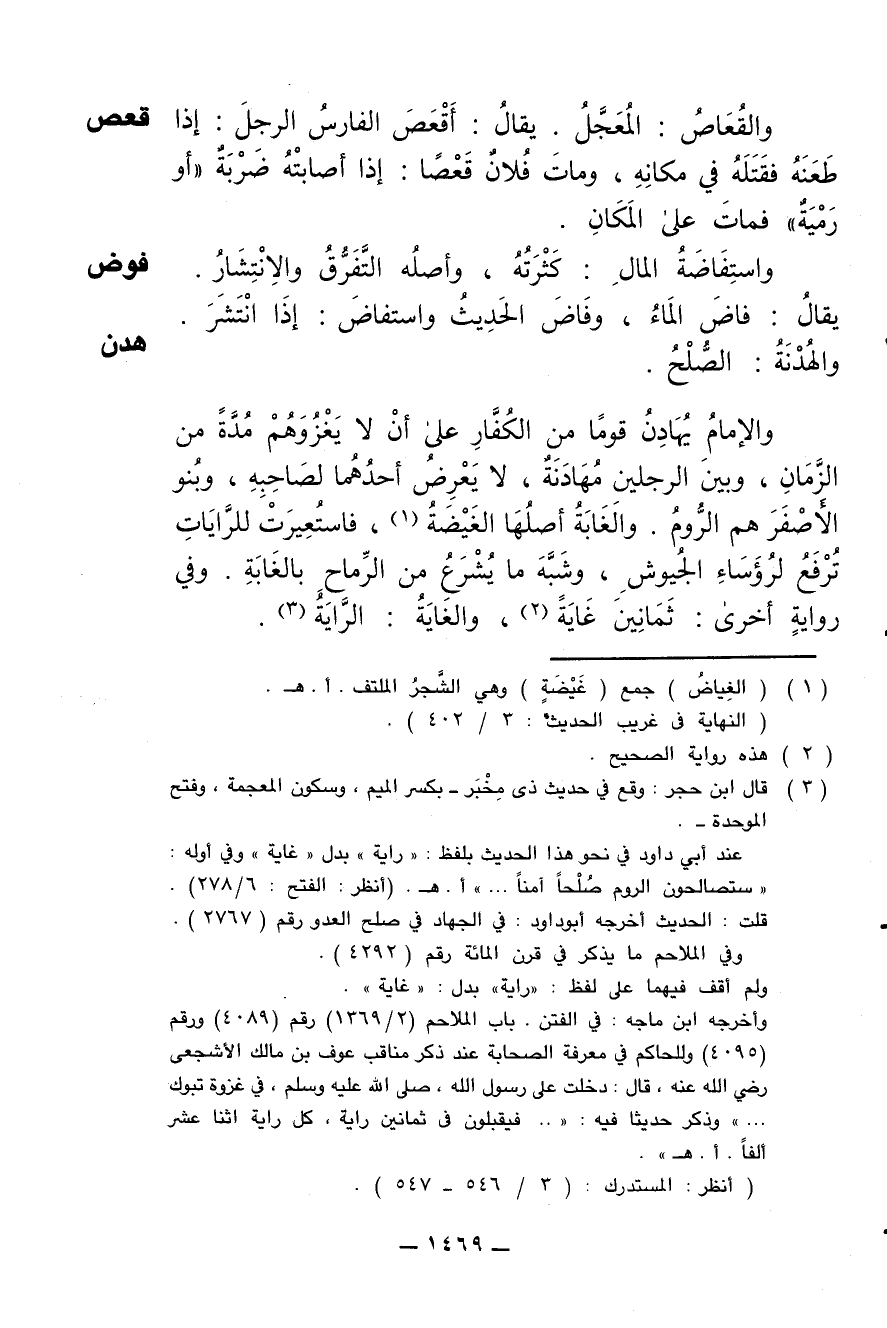 والإمام يهادن قوما من الكفار على أن لا يغزوهم مدة من الزمان، وبين الرجلين مهادنة، لا يعرض أحدهما لصاحبه، وبنو الأصفر هم الروم. والغابة أصلها الغيضة، فاستعيرت للرايات ترفع لرؤساء الجيوش، وشبه ما يشرع من الرماح بالغابة. وفي رواية أخرى: ثمانين غاية، والغاية: الراية.