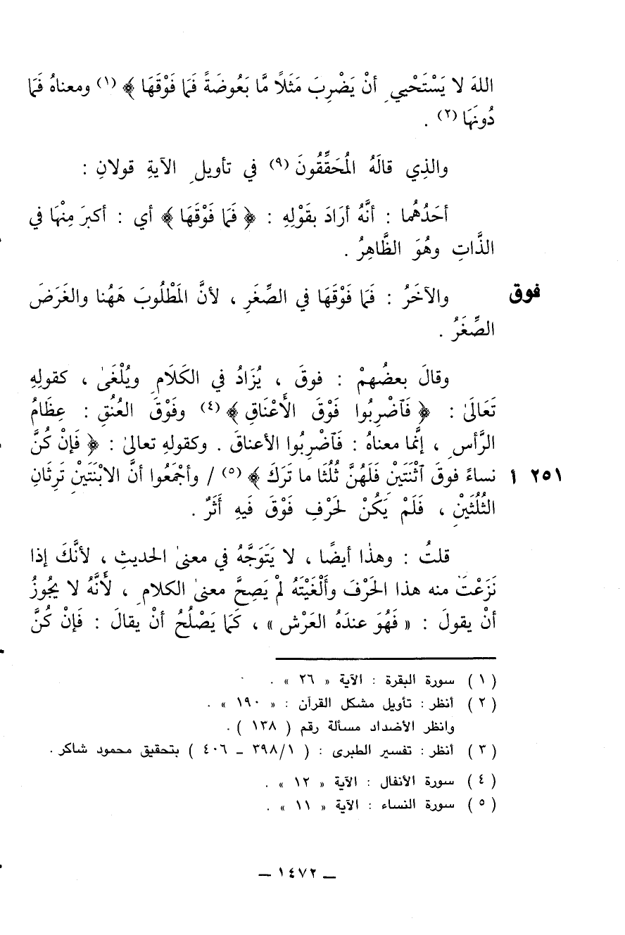 وقال بعضهم: فوق، يزاد في الكلام ويلغى، قوله تعالى: {فاضربوا فوق الأعناق} وفوق العنق: عظام الرأس، إنما معناه: فاضربوا الأعناق. وكقوله تعالى: {فإن كن نساء فوق اثنتين فلهن ثلثا ما ترك} / وأجمعوا أن الابنتين ترثان الثلثين، فلم يكن لحرف فوق فيه أثر.