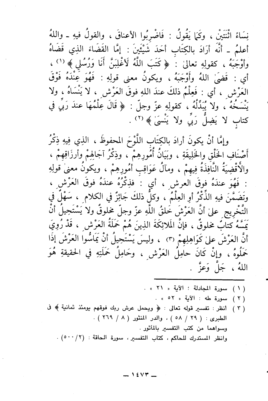 نساء اثنتين، وكما يقول: فاضربوا الأعناق، والقول فيه- والله أعلم- أنه أراد بالكتاب أحد شيئين: إما القضاء الذي قضاه وأوجبه، كقوله تعالى: {كتب الله لأغلبن أنا ورسلي}، أي: قضى الله وأوجبه، ويكون معنى قوله: فهو عنده فوق العرش، أي: فعلم ذلك عند الله فوق العرش، لا ينساه، ولا ينسخه ولا يبدله، كقوله عز وجل: {قال علمها عند ربي في كتاب لا يضل ربي ولا ينسى}.