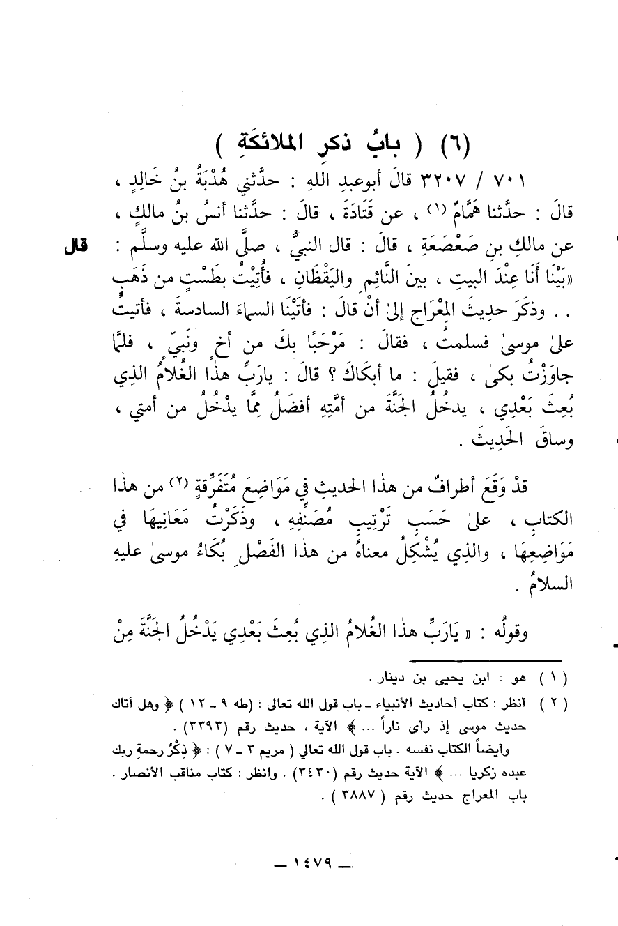 701/ 3207 - قال أبو عبد الله: حدثني هدبة بن خالد، قال: حدثنا همام، عن قتادة، قال: حدثنا أنس بن مالك، عن مالك بن صعصعة، قال: قال النبي، صلى الله عليه وسلم: (بينا أنا عند البيت، بين النائم واليقظان، فأتيت بطست من ذهب .. وذكر حديث المعرج إلى أن قال: فأتينا السماء السادسة، فأتيت على موسى فسلمت، فقال: مرحبا بك من أخ ونبي، فلما جاوزت بكي، فقيل: ما أبكاك؟ قال: يا رب هذا الغلام الذي بعث بعدي، يدخل الجنة من أمته أفضل مما يدل من أمتي، وساق الحديث.
