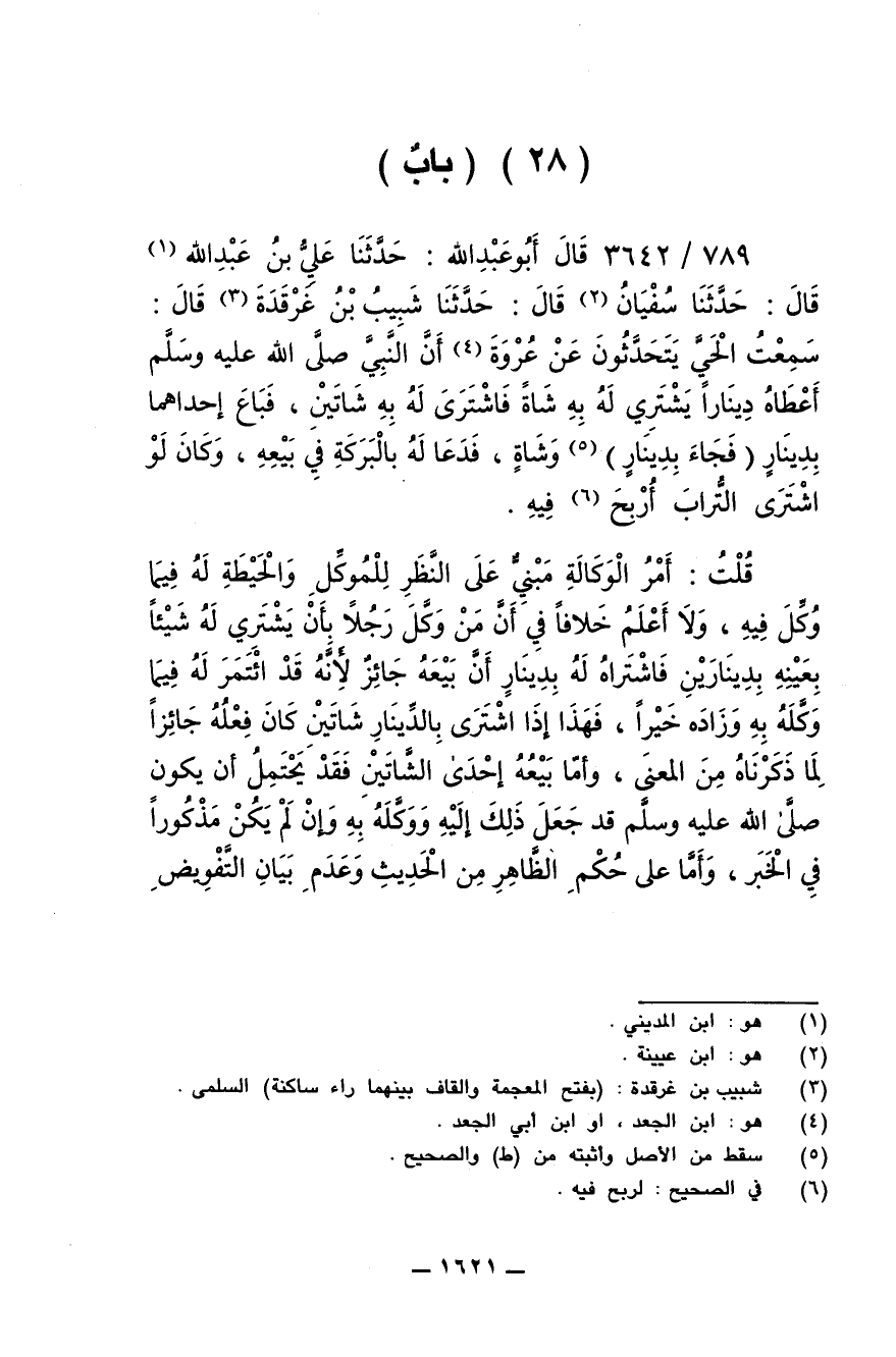 789/ 3642 - قال أبو عبد الله: حدثنا علي بن عبد الله قال: حدثنا سفيان قال: حدثنا شبيب بن غرقدة قال: سمعت الحيَّ يتحدثون عن عروة أن النبي صلى الله عليه وسلم أعطاه ديناراً يشتري له به شاة فاشترى له به شاتين ,فباع إحداهما بدينار (فجاء بدينار) وشاة, فدعا له بالبركة في بيعه , وكان لو اشترى التراب أُربح فيه.