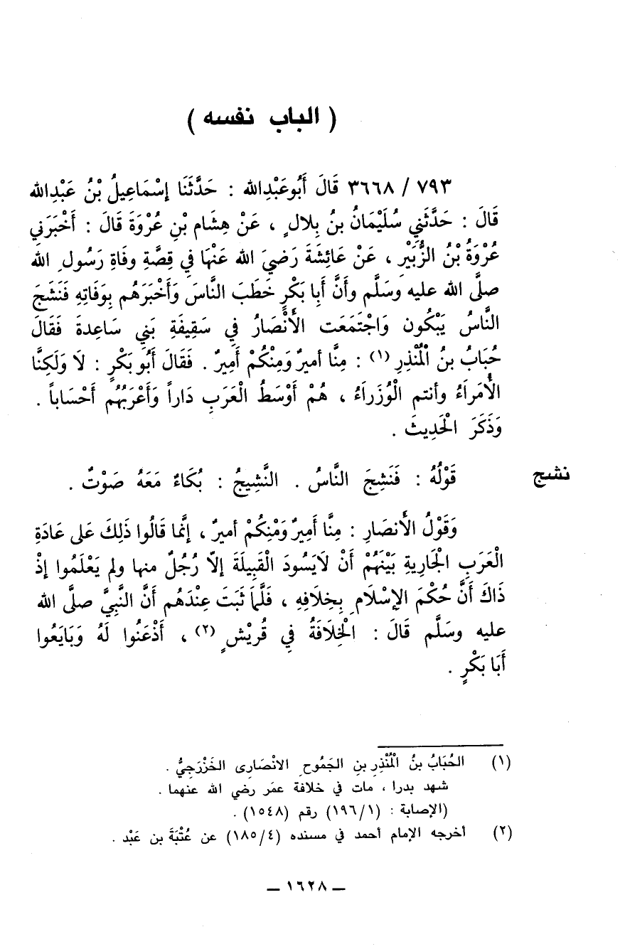 793/ 3668 - قال أبو عبد الله: حدثنا إسماعيل بن عبد الله قال: حدثني سليمان بن بلال ,عن هشام بن عروة قال: أخبرني عروة بن الزبير وعن عائشة رضي الله عنها في قصة وفاة رسول الله صلى الله عليه وسلم وأن أبا بكر خطب الناس وأخبرهم بوفاته فنشج الناس يبكون واجتمعت الأنصار في سقيفة بني ساعدة فقال حباب بن المنذر: منا أمير ومنكم أميرٌ. فقال أبو بكر: لا ولكنا الأمراء وأنتم الوزراء, هم أوسط العرب داراً وأعربهم أحساباً.
