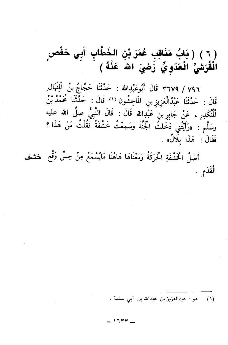 796/ 3679 - قال أبو عبد الله: حدثنا حجاج بن المنهال قال: حدثنا عبد العزيز بن الماجشون قال: حدثنا محمد بن المنكدر, عن جابر بن عبد الله قال: قال النبي صلى الله عليه وسلم:"رأيتني دخلت الجنة وسمعت خشفةً فقلت من هذا؟ فقال: هذا بلال ".