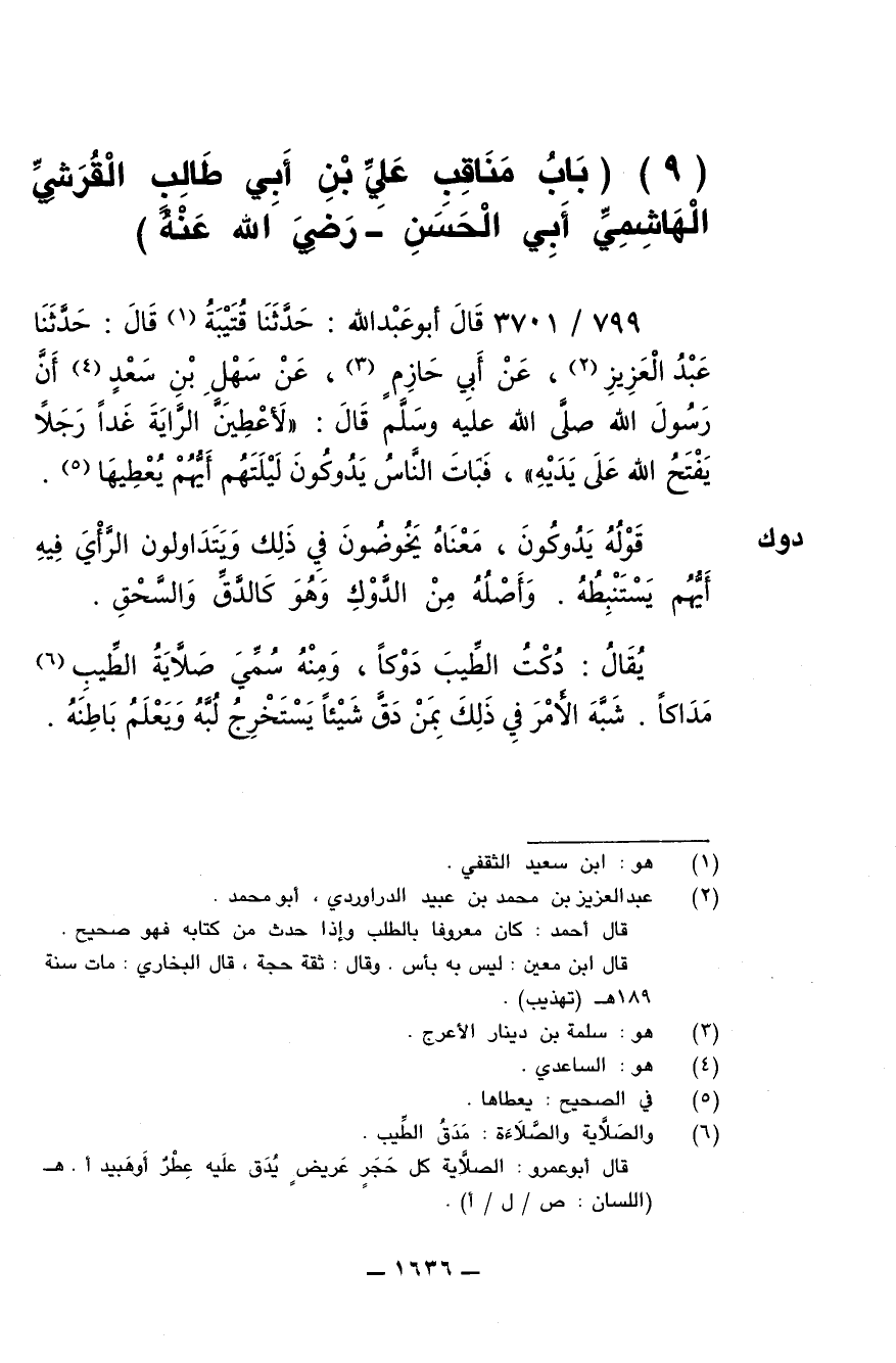 عبد العزيز ,عن أبي حازم ,عن سهل بن سعد أن رسول الله صلى الله عليه وسلم قال:" لأعطين الراية غداً رجلاً يفتح الله على يديه",فبات الناس يدوكون ليلتهم أيُّهم يُعطيها.