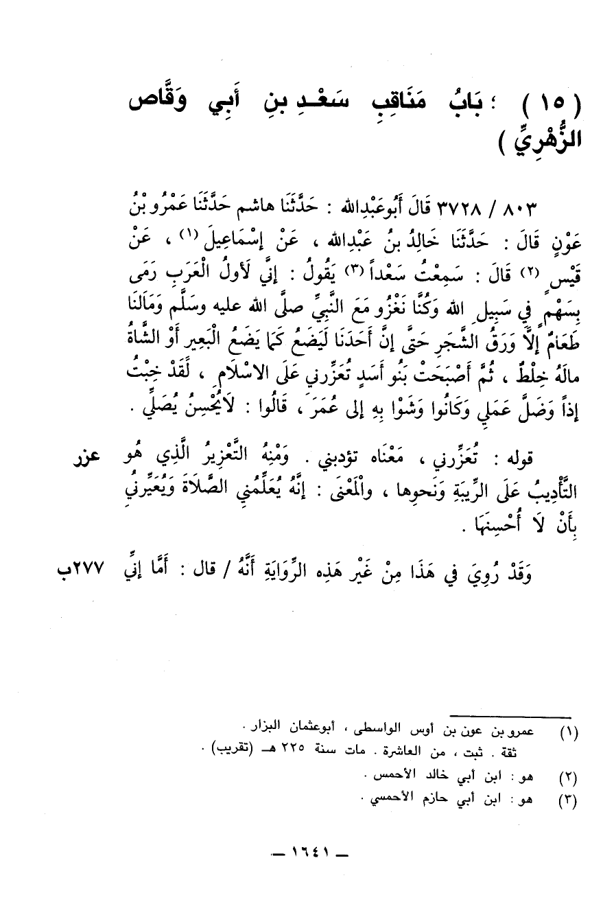 803/ 3728 - قال أبو عبد الله: حدثنا هاشم حدثنا عمرو بن عون قال: حدثنا خالد بن عبد الله ,عن إسماعيل ,عن قيس قال: سمعت سعداً يقول: إني لأول العرب رمَى بسهمٍ في سبيل الله وكنَّا نغزو مع النبي صلى الله عليه وسلم ومالنا طعام إلا ورق الشجر حتى إن أحدنا ليضع كما يضع البعير أو الشاة ماله خلطٌ, ثم أصبحت بنو أسد تُعزِّرني على الإسلام, لقد خِبتُ إذاً وضلَّ عملي وكانوا وشوا به إلى عمر, قالوا: لا يحسن يُصلِّي.