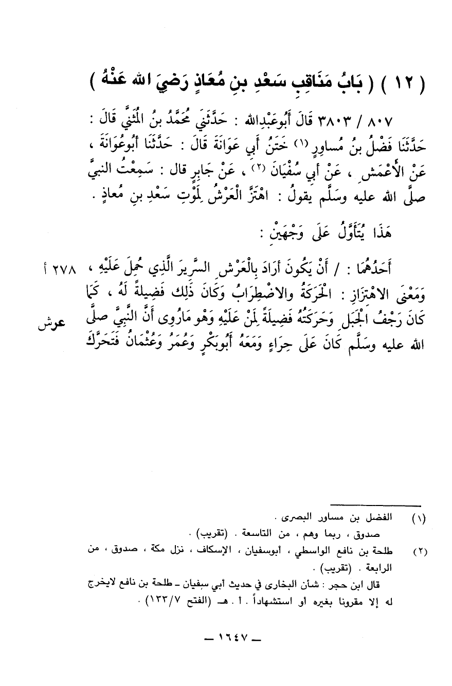 807/ 3803 - قال أبو عبد الله: حدثني محمد بن المثني قال: حدثنا فضل بن مساور ختن أبي عوانة قال: حدثنا أبو عوانة، عن الأعمش، عن أبي سفيان، عن جابر قال: سمعت النبي صلى الله عليه وسلم يقول: اهتز العرش لموت سعد بن معاذ.