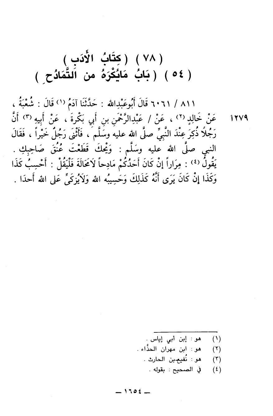 811/ 6061 - قال أبو عبد الله: حدثنا آدم قال: شعبة، عن خالد، عن / عبد الرحمن بن أبي بكرة، عن أبيه أن رجلا ذكر عند النبي صلى الله عليه وسلم، فأثنى رجل خيرا، فقال النبي صلى الله عليه وسلم: ويحك قطعت عنق صاحبك. يقول: مرارا إن كان أحدكم لا محالة فليقل: أحسب كذا وكذا إن كان يرى أنه كذلك وحسيبه الله ولا يزكى على الله أحداً.