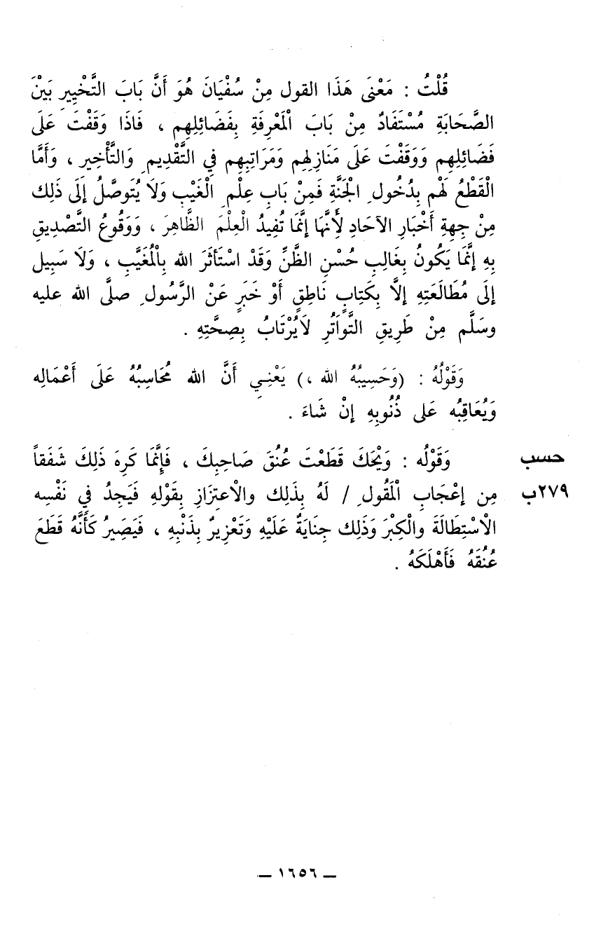 قلت: معنى هدا القول من سفيان هو أن باب التخيير بين الصحابة مستفاد من باب المعرفة بفضائلهم، فاذا وقفت على فضائلهم ووقفت على منازلهم ومراتبهم في التقديم والتأخير، وأما القطع لهم بدخول الجنة فمن باب علم الغيب ولا يتوصل إلى ذلك من جهة أخبار الآحاد لأنها إنما تفيد العلم الظاهر، ووقوع التصديق به إنما يكون بغالب حسن الظن وقد استأثر الله بالمغيب، ولا سبيل إلى مطالعته إلا بكتاب ناطق أو خبر عن الرسول صلى الله عليه وسلم من طريق التواتر لا يرتاب بصحته.