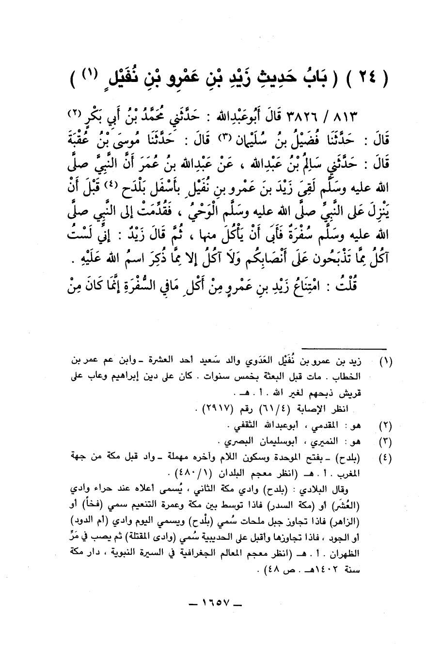 813/ 3826 - قال أبو عبد الله: حدثني محمد بن أبي بكر قال: حدثنا فضيل بن سليمان قال: حدثنا موسى بن عقبة قال: حدثني سالم بن عبد الله، عن عبد الله بن عمر أن النبي صلى الله عليه وسلم لقى زيد بن عمرو بن نفيل بأسفل بلدح قبل أن ينزل على النبي صلى الله عليه وسلم الوحي، فقدمت إلى النبي صلى الله عليه وسلم سفرة فأبى أن يأكل منها، ثم قال زيد: إني لست آكل مما تذبحون على أنصابكم ولا آكل إلا مما ذكر اسم الله عليه.