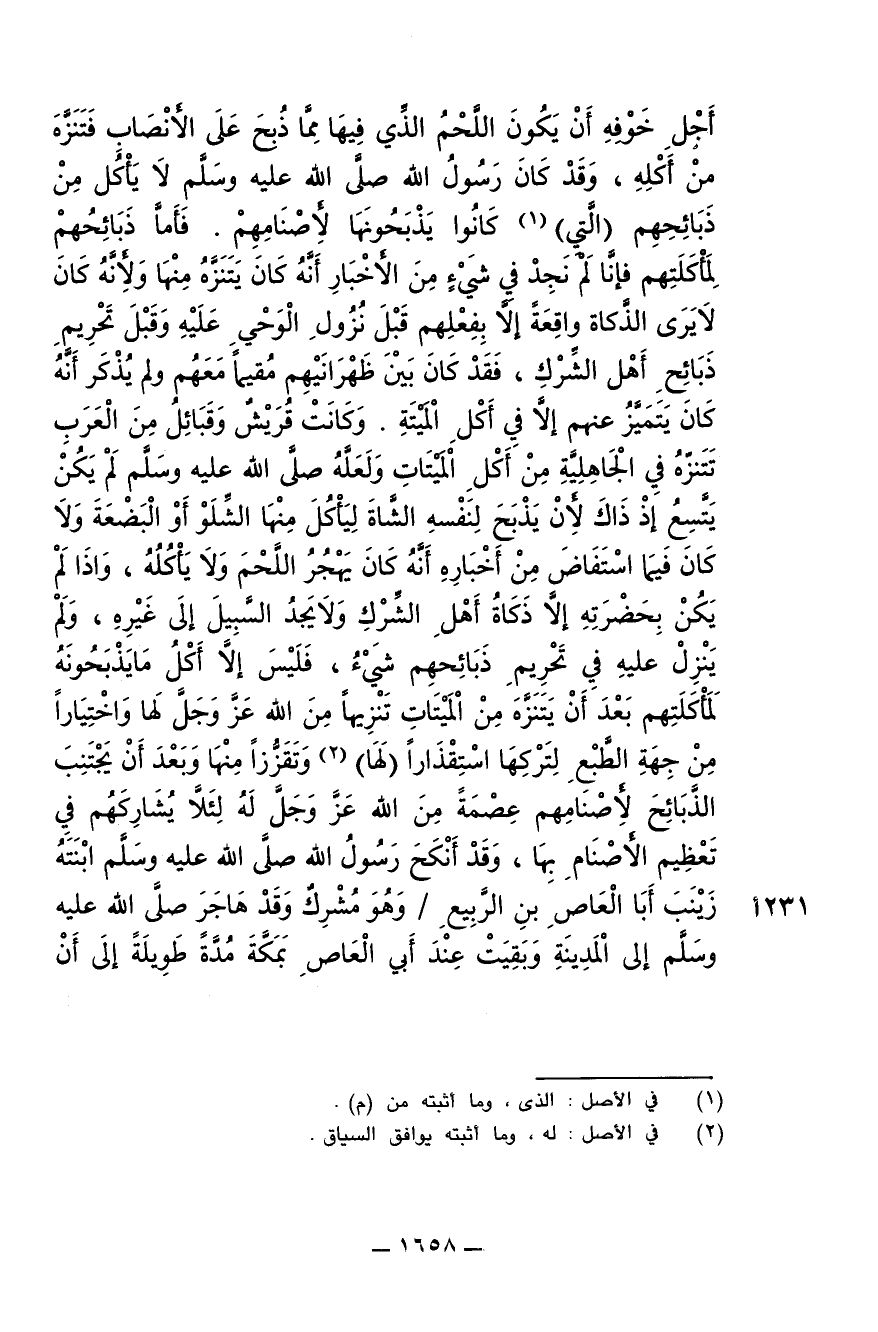 أجل خوفه أن يكون اللحم الذي فيها مما ذبح على الأنصاب فتتنزه من أكله، وقد كان رسول الله عليه وسلم لا يأكل من ذبائحهم (التي) كانوا يذبحونها لأصنامهم. فأما ذبائحهم لمأكلتهم فإنا لم نجد في شيء من الأخبار أنه كان يتنزه منها ولأنه كان لا يرى الذكاة واقعة إلا بفعلهم قبل نزول الوحي عليه وقبل تحريم ذبائح أهل الشرك، فقد كان بين ظهرانيهم مقيما معهم ولم يذكر أنه كان يتميز عنهم إلا في أكل الميتة. وكانت قريش وقبائل من العرب تتنزه في الجاهلية من أكل الميتات ولعله صلى الله عليه وسلم لم يكن يتسع إذ ذاك لأن يذبح لنفسه الشاة ليأكل منها الشلو أو البضعة ولا كان فيما استفاض من أخباره أنه كان يهجر اللحم ولا يأكله، واذا لم يكن بحضرته إلا ذكاة أهل الشرك ولا يجد السبيل إلى غيره، ولم ينزل عليه في تحريم ذبائحهم شيء، فليس إلا أكل ما يذبحونه لمأكلتهم بعد أن يتنزه من الميتات تنزيها من الله عز وجل لها واختيارا من جهة الطبع لتركها استقذارا (لها) وتقززا منها وبعد أن يتجنب الذبائح لأصنامهم عصمة من الله عز وجل له لئلا يشاركهم في تعظيم الأصنام بها، وقد أنكح رسول الله صلى الله عليه وسلم ابنته زينب أبا العاص بن الربيع / وهو مشرك وقد هاجر صلى الله عليه وسلم إلى المدينة وبقيت عند أبي العاص بمكة مدة طويلة إلى أن
